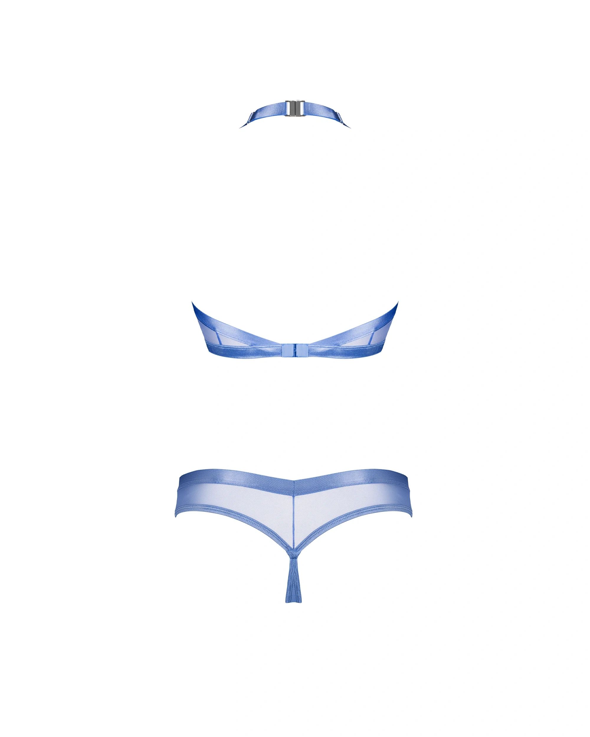 A primal inferno, enfolded in sheer, seraphic blue. A set of transparent innocence, bare camouflage destined to enrapture. The top, intricately designed with discreet back hooks, an adjustable neck strap, and a resplendent silver clasp adorning the neckline, harmonizes fluidly with the V-shaped thong. Crafted from the finest blue mesh, intertwined with supple elastic trim, this ensemble radiates a celestial balance of sensuality and refinement. Embrace your divine essence.