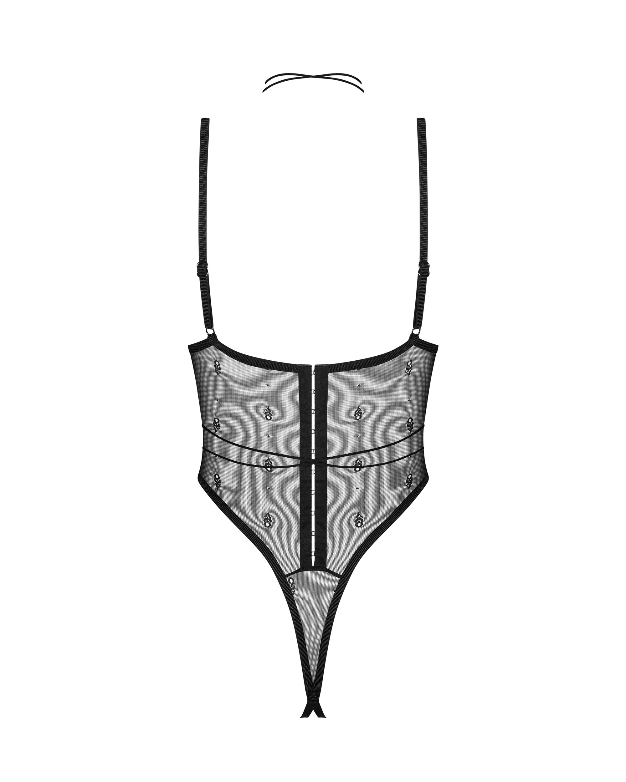 Featuring high-cut style and tantalizing neckline straps anchored by structured underwire for added support. Baring it all with confidence, the crotchless design accentuates the hips and buttocks. Delicate, elastic bands create versatile choker options. Hook and eye closure, adjustable straps, and crotch straps for the perfect fit.