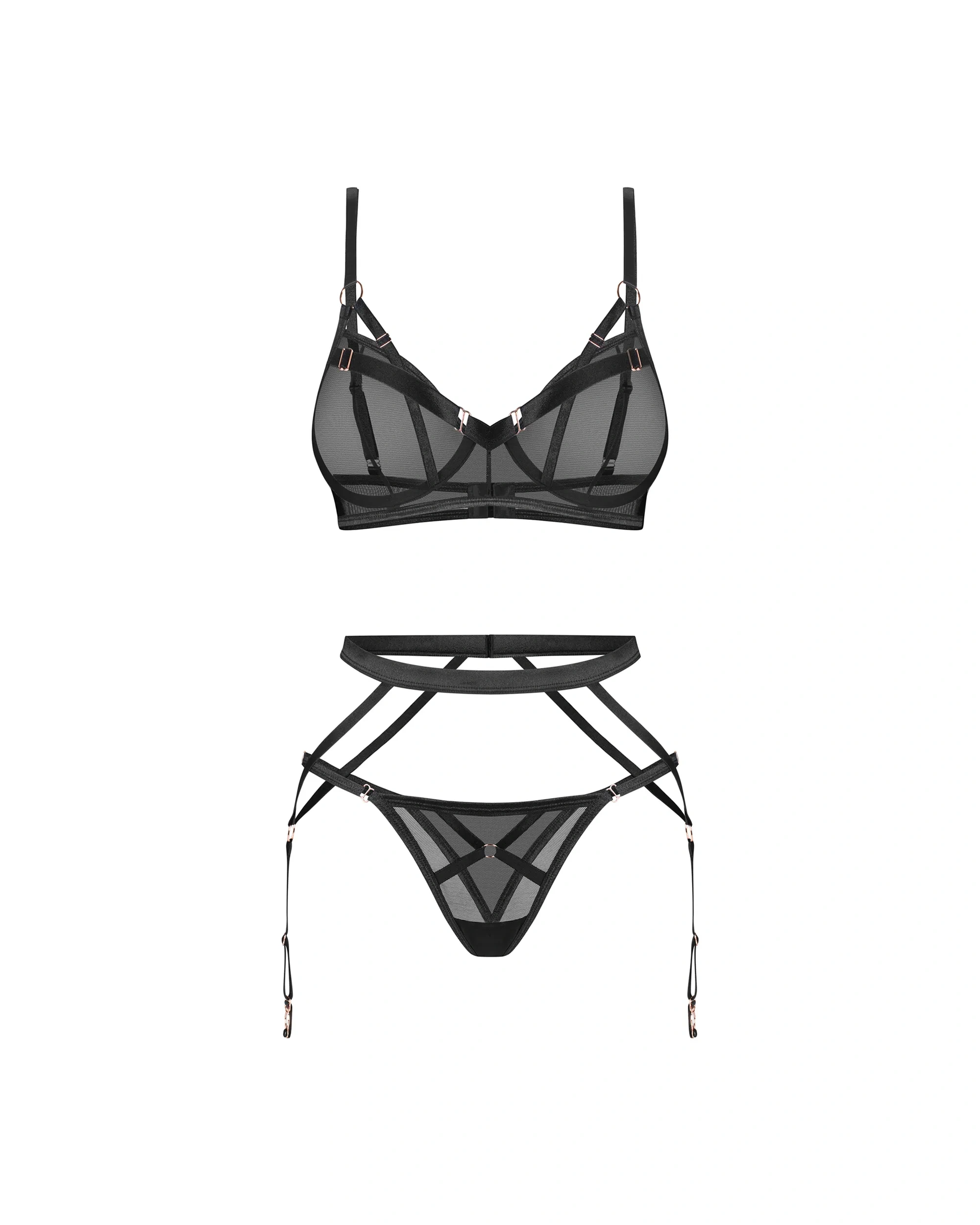 Set: underwired bra, tanga, garter belt