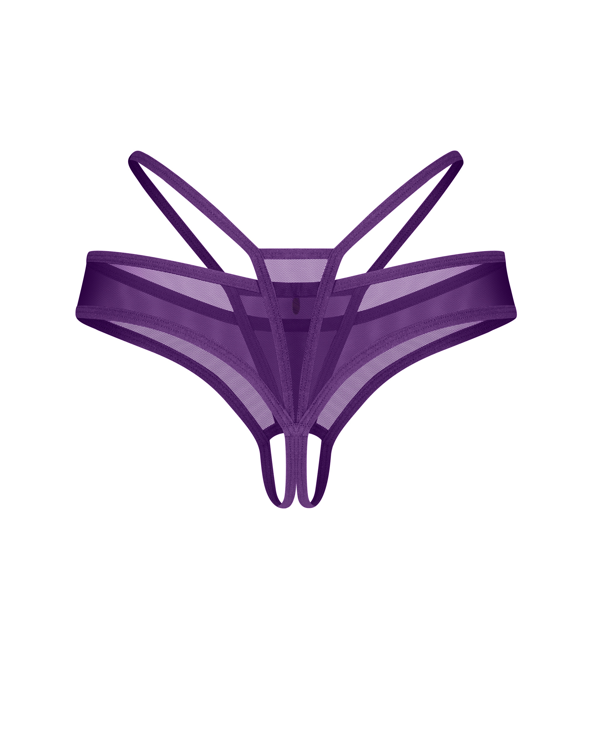 This crotchless thong captivates with the bold design and intense, deep shade of purple. The transparent mesh wraps around the body like a second skin, while the layered interplay of straps creates an exceptionally sensual and modern composition. The silver charm at the front doesn’t distract attention from the design – it enhances its character. Made to impress, no matter the occasion.