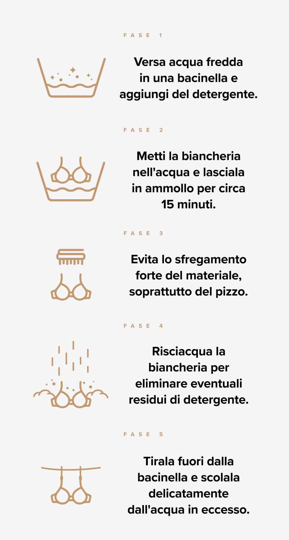 Lava il prodotto prima del primo utilizzo. Lava gli elementi dei set di lingerie insieme per assicurarti che le sfumature rimangano coerenti. Non "risparmiare" la tua lingerie preferita per occasioni speciali; indossala e sentiti speciale ogni giorno! Se appaiono macchie, ricorda: più presto le tratti, meglio è. Testa qualsiasi prodotto per la rimozione delle macchie su un'area non visibile. Spesso, i metodi tradizionali funzionano meglio, come il bagno in acqua fredda o l'uso di sapone grigio.