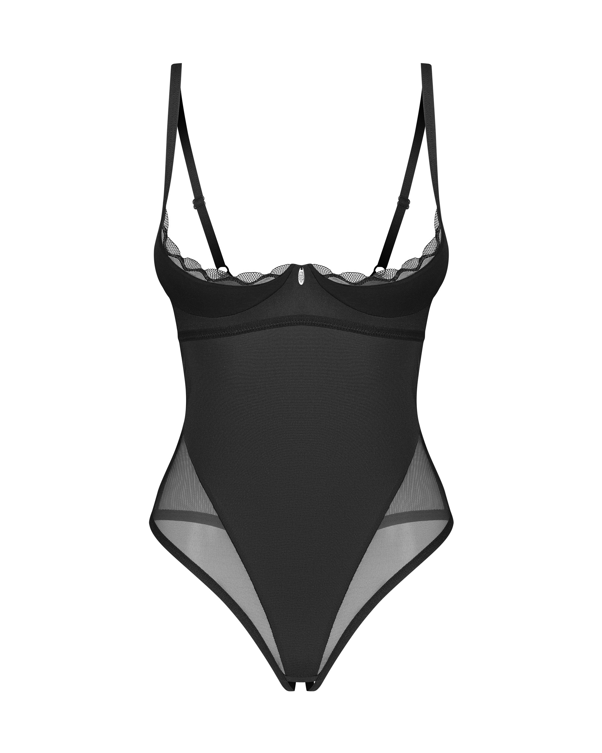 Scopri il teddy Stelisa senza cavallo con mezza coppa e taglio a gamba alta. Combina morbido tessuto nero con inserti trasparenti. Scegli questo stile straordinario che valorizza tutte le curve femminili.