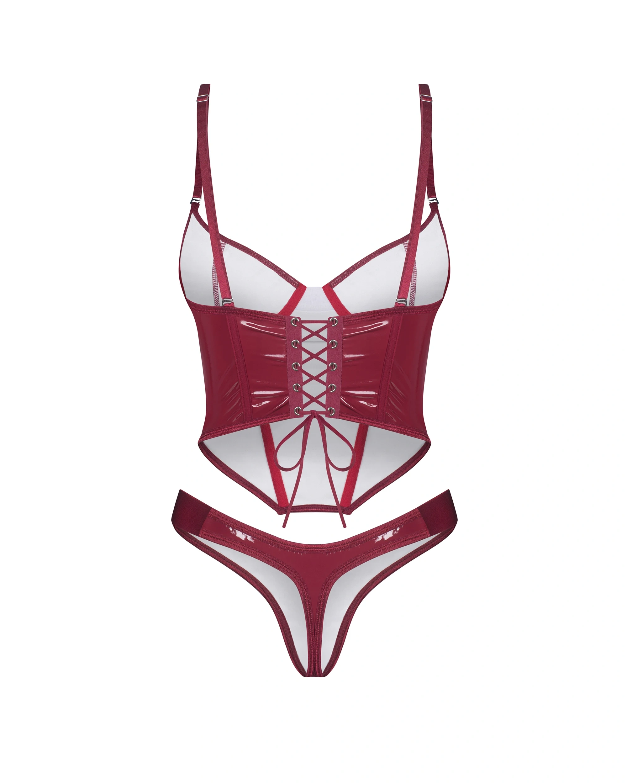 Un set audace dal design eccezionalmente sensuale. Il materiale liscio e lucido crea una brillantezza simile a uno specchio che valorizza le curve e aggiunge carattere raffinato al look. Il taglio sexy, valorizzato da cuciture modellanti, si adatta perfettamente alla silhouette, mentre l’allacciatura sul retro permette una regolazione precisa. Le coppe morbide e le spalline regolabili garantiscono un comfort ottimale. Il perizoma abbinato completa il look seducente, creando un set armonioso ed elegante.