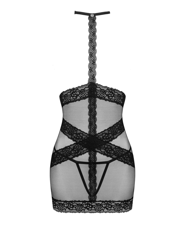The black Lacrisia chemise is a very bold and spicy proposal. The translucent mesh and lace finish beautifully emphasise and embrace the body, and the extremely hot cut tempts and intrigues. The exposed bust and back guarantee even more pleasure, and the sensual choker perfectly adorns the neck and cleavage.