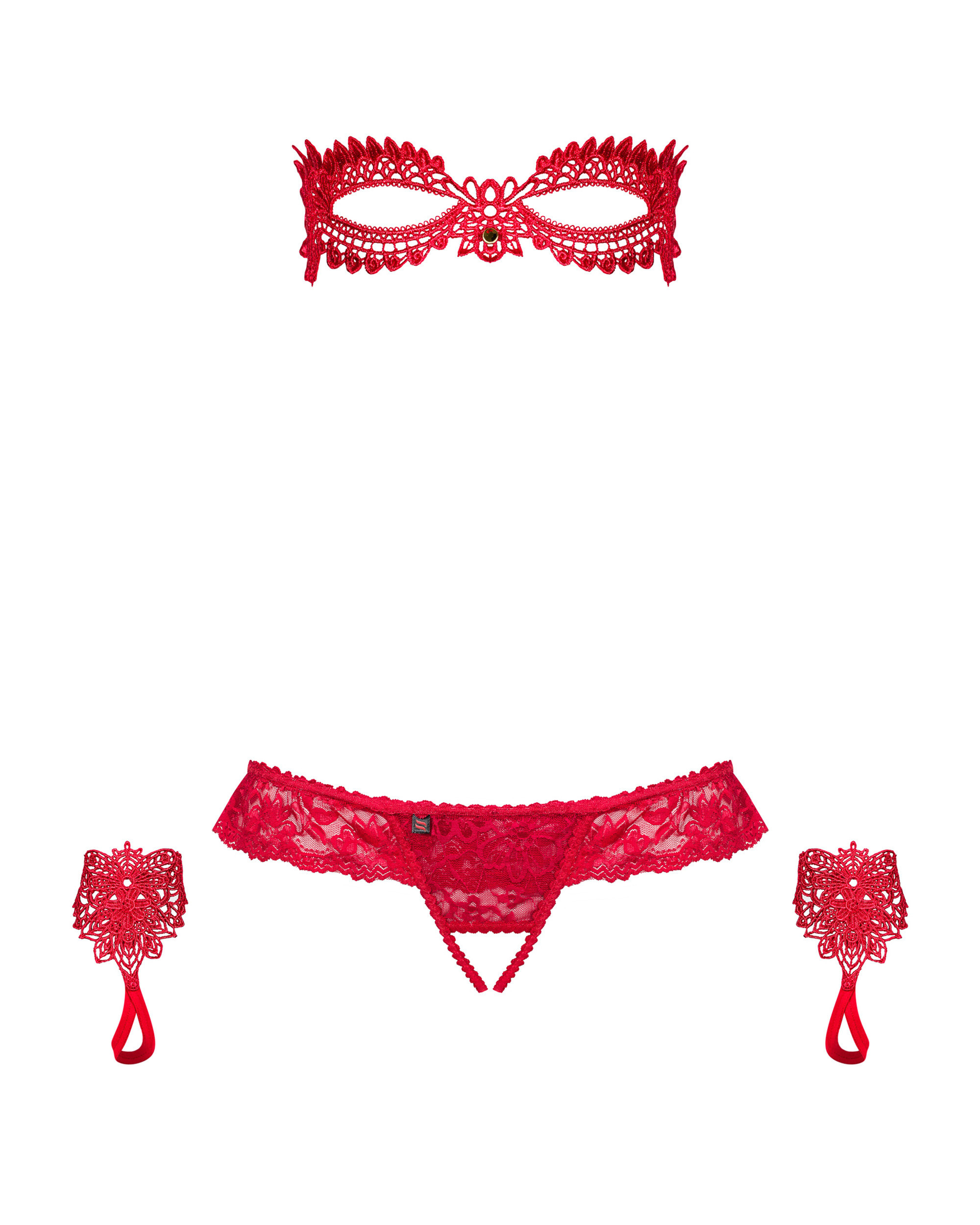 Do you dream about the night full of love and pleasures? Be tempted by Hetea set in juicy, intense red and you’ll blush once you’ll see it! Mask will give you little bit of mystery, mittens – elegance and chic, and thanks to crotchless thong – it will be extremely spicy! When you feel softness of delicate lace on your own skin… you’ll fall in love with it from the first touch.